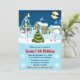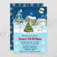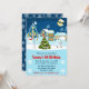 Snowy Winter Christmas Village Scene design with a snowman and christmas tree, and santa's sleigh in the sky, on a blue background