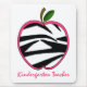 A Kindergarten teacher gift featuring an illustration of a zebra print apple with pink trim. Pink text under apple says "Kindergarten Teacher." Look for this design on other items at The Pink Schoolhouse.