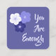 Show support with Kindness Cards! These are square business card sized cards with positive and inspirational words to hand out to friends, hide in family member's lunches, or leave for a stranger to find to brighten up their day. This design includes flowers in shades of purple and white. The text "You Are Enough" is to remind someone that they are good enough, smart enough, beautiful enough and strong enough.