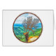 A landscape and elk painting within a circle border frame. This mighty elk has grown trees as antlers. He stands tall watching over his forest of hills and bodies of water.