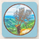 A landscape and elk painting within a circle border frame. This mighty elk has grown trees as antlers. He stands tall watching over his forest of hills and bodies of water.