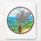 A landscape and elk painting within a circle border frame. This mighty elk has grown trees as antlers. He stands tall watching over his forest of hills and bodies of water.