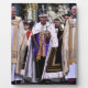 King Charles III wearing the St. Edward's Crown and royal robe, holding the orb and sceptre on Coronation Day May 6, 2023