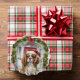 A Christmas Holiday Ornament Card with King Charles Spaniel Dog in a Santa hat and holiday lights, stood in front of a Christmas decorated front door. King Charles Spaniel dog Holiday decoration cards, a unique wonderful alternative to a traditional card from Ricaso - add your own text