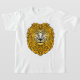 Lion graphic with yellow and black, on boy's white t-shirt.