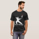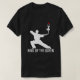 Silhouette images of a martial arts warrior in a fighting stance. Small silhouette image of a beautiful ballerina who stands on the open palm of the gentleman and dance on the tips of her toe or en pointe. Her hands are risen up in an attempt to embrace the small red heart hovering above her head. Text KING OF THE QUEEN under the images. Black background Funny one-of-a-kind t-shirt for a man. You can change or delete the text.