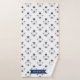 Towel set with three towels: a washcloth with navy blue stripes and an illustration of a polar bear with a paw print; a striped hand towel with the same look; and a bath towel featuring a pattern of polar bears in black, white, and grey. Personalise with your child's name on each towel.