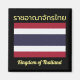 This magnet: Says Kingdom of Thailand above (in Thai) the flag and below (in English) with yellow letters.