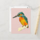 This is a watercolor painting of a kingfisher bird. It is sitting on the edge of a branch. The bird has bright colours. Orange and yellow on his belly and green on his head and wings. He is looking sideways.