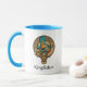 Kingfisher crest badge surrounded by a strap and buckle over tartan background. Custom text on both sides.