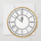This New Years party invitation features a black clock with Roman numerals on a white background. Around the edge of the invitation is a faux gold border. The interior of the clock says "Kiss me at Midnight." All the party details are on the back and can be customised to meet the needs of your event.