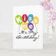Colourful balloons and black text birthday design that reads "Kiss Me It's My Birthday!" on birthday cards, mugs, T-shirts, and other birthday apparel and gift items.