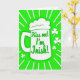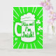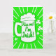 This greeting card opens on a bright green background that sets a lively St. Patrick’s Day scene. In the center sits a white beer mug with a foamy top, drawn with smooth shapes that make it stand out. Across the front of the mug, the phrase “Kiss me! I’m Irish!” appears in looping green lettering, giving it a flirty, friendly nudge 💚. Behind the mug, white rays spread outward like a spotlight, adding energy and a sense of celebration. Small white shamrocks are scattered around the green space, like little lucky notes drifting through the air ☘️. The simple green-and-white palette keeps the focus on the mug and message, like a quick glance shared across a crowded party. The foam is rounded and cloudlike, and the white rays fan out evenly from behind the mug.