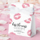 Cute bachelorette party favour box featuring pink faux glitter lipstick marks, the funny saying 'kiss the miss goodbye', their name, and the date of the party!