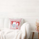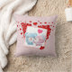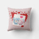 A pillow with a cute cartoon image of a bear pair, one bear is pastel pink with a little bow and she is kissing the cheek of a blue bear who looks positively delighted. Very cute and kawaii. Lots of red hearts floating all around. Muted Pink background with a white polka dot pattern