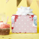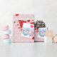 Wrapping paper with a cute cartoon image of a bear pair, one bear is pastel pink with a little bow and she is kissing the cheek of a blue bear who looks positively delighted. Very cute and kawaii. Lots of red hearts floating all around.  Muted Pink background with a white polka dot pattern