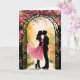 The silhouettes of a kissing couple under a flower-covered arch in a garden creates a sweet, romantic Valentine card for your love.