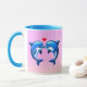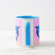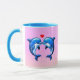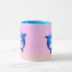 Two blue dolphins facing with a red heart between them on a pink bubbly background—cute wraparound ceramic mug for couples and ocean lovers.