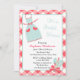 A fun kitchen bridal shower invitation with blue and white polka dot apron, kitchen utensils tied with a pink bow and pink and white gingham border. Graphics ©http://myclipartstore.com