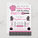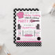 Modern kitchen cooking themed birthday party invitations feature typography, kitchen accessories and utensils, and polka dot patterns in a black, pink, and white color scheme.