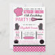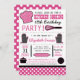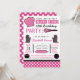 Modern kitchen cooking themed birthday party invitations feature typography, kitchen accessories and utensils, and polka dot patterns in a black, pink, and white colour scheme.