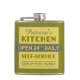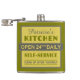 The flask itself is fine. It’s a cheap flask, obviously bought in bulk, however am prepared to overlook that. Given that it is a personalized item, I would have liked to have seen gift boxing instead of the generic packaging. Terrible printing, and/or quality. It’s a cheap, tacky vinyl. It is not cut straight and is also applied in a way that it is overhanging the bottom, causing the glue to catch on items and it will eventually roll and tear, damaging the wrap.