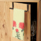 Pink roses. Each of three stems has a single rose blossom. Two large flowers stand in corners and flower leans towards centre. Third, small flower between the other two. Placed on a pale yellow background.