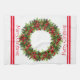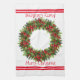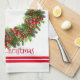 Holiday kitchen towel shown in white with a festive Christmas berry wreath design. Text of Merry Christmas in Red on both ends of towel.