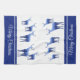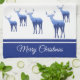 This kitchen towel is shown in wintery blue and white colours with white accent stripes over royal blue. Several deer in blue tones with wintery scenes shadowing on their bodies grace both ends of this towel. Text of Merry Christmas. Over white background.