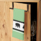 This kitchen towel is shown in a cute lodge style print of bears and fir tree icons in black silhouettes over white and black stripes and apple green and white accent colour stripes towel.