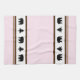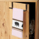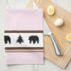 This kitchen towel is shown in a cute lodge style print of bears and fir tree icons in black silhouettes over white stripes and blush pink colour stripes towel with golden-tan accent stripes on each end.