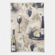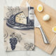 A chic, modern kitchen towel design with elegant wine glasses, bottles of wine, grapes and cheese platters, set against a neutral background for a sophisticated feel