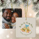 First Christmas engaged personalised keepsake ornament with photo on the back. Created from hand drawn kitschy watercolor bells and bow. Original art by Leslie Larson.