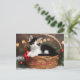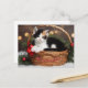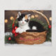 An adorable Christmas Postcard that will make anyone smile. Kitten sitting pretty in a wicker basket that is decked in holiday garland. Send one to your friends this season.