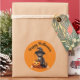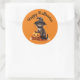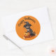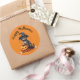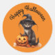 Cute picture of a kitten wearing a witch's hat and leaning on a smiling pumpkin, is featured on this round sticker for Halloween. With message, "Happy Halloween", this sticker can be used for special mailings, decorating, scrap booking and more!