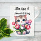 Send a bundle of pure joy with this adorable kitten greeting card! Featuring an irresistibly cute big-eyed kitten holding a vibrant bouquet of pink and purple tulips, this whimsical design is perfect for any occasion that calls for sweetness and smiles. The front reads "Kitten Kisses & Flower Wishes" in elegant playful script.