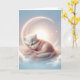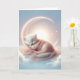 A white kitten wrapped in a cosy pink blanket rests on a glowing crescent moon, surrounded by fluffy clouds and twinkling stars.