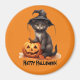 Cute picture of a kitten wearing a witch's hat and sitting next to a carved pumpkin, is featured on this round magnet for Halloween. With message, "Happy Halloween", this magnet will make a cute decoration for your home or office. Makes a great little gift too!