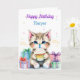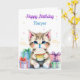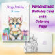 Cute birthday card for girls. Cute for a child or adult. A kitten holding a birthday cupcake surrounded by gifts. You can customise the card by adding a name in the personalise area. Cute puppy and birthday pun inside along with a colouring page. Cute pink, purple, green and blue.