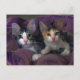 Two curious kittens are snuggled in a purple bed. The kitten on the left, the boy, is a grey and white tabby cat. The other is a calico girl.