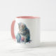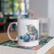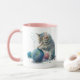 This mug features a cartoon drawing of a kitten/ cat playing with a ball of yarn in watercolor.