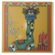 Green & red frame, orange brown background with folk primitive illustrated cat in a patched stocking, bordered with holly and a candle. Decorative unique cards and gifts with a kitty in a stocking. Illustrations by Trina Clark. Design by Deborah Miller.