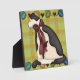 Green, blue, plaid background with folk primitive illustrated black and white cat trimmed with balls of yarn and hearts. Decorative and useful unique gifts for her. Cat and yarn trim illustration by Trina Clark. Design by Deborah Miller.