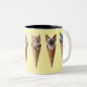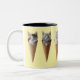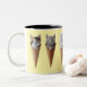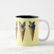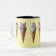 Six breeds of cats sticking out of ice cream cones are circling a coffee cup.