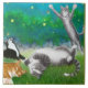 Original fine art painting of cats having fun chasing and watching fireflies in the backyard by artist Carolyn McFann printed on a quality ceramic tile.