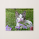 Pretty tiger and white kitty cat and pink/purple petunias in this puzzle