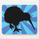 Silhouette shapes of the New Zealand kiwi bird against bright blue background.