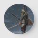 A knight in full armour stands sword in hand in a field before a menacing sky.