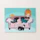 An Adorable 11" x 14" Puzzle Cartoon Of A Lady And Her Cats Knitting Away.