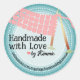Fat knitting needles with knitted scarf on this knitter's "handmade with love" sticker for gifting or craft show sales, personalised with your text, fonts, and colour scheme.